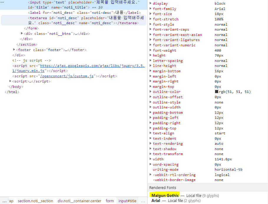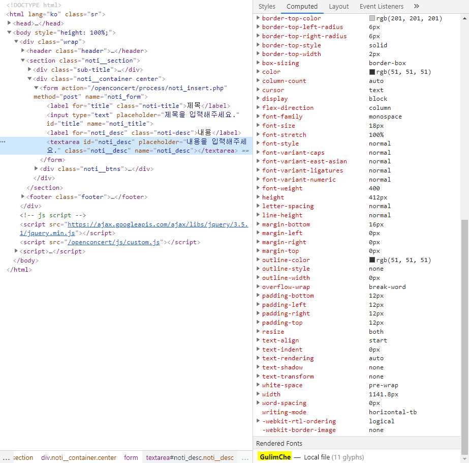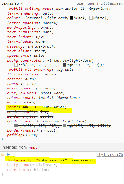 태그를 좀 더 자세히 살펴보자면 textarea는 body에 걸린 font-family를 무시하는 것을 확인할 수 있다.