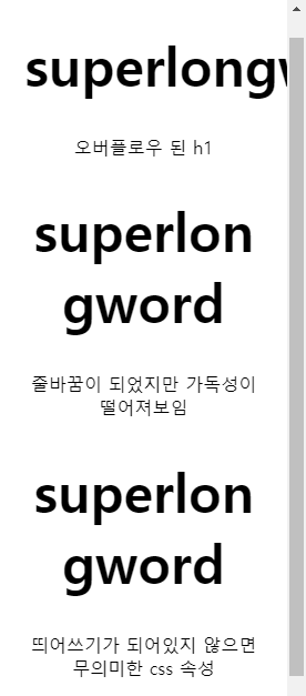 하지만 이 속성은 h1 등 제목 태그에서 내 마음대로 줄바꿈이 되지 않는다는 단점이 있다.