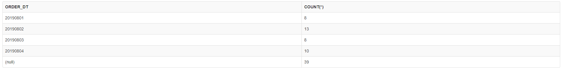 SELECT ORDER_DT, COUNT(*) FROM STARBUCKS_ORDER GROUP BY CUBE(ORDER_DT) ORDER BY ORDER_DT;