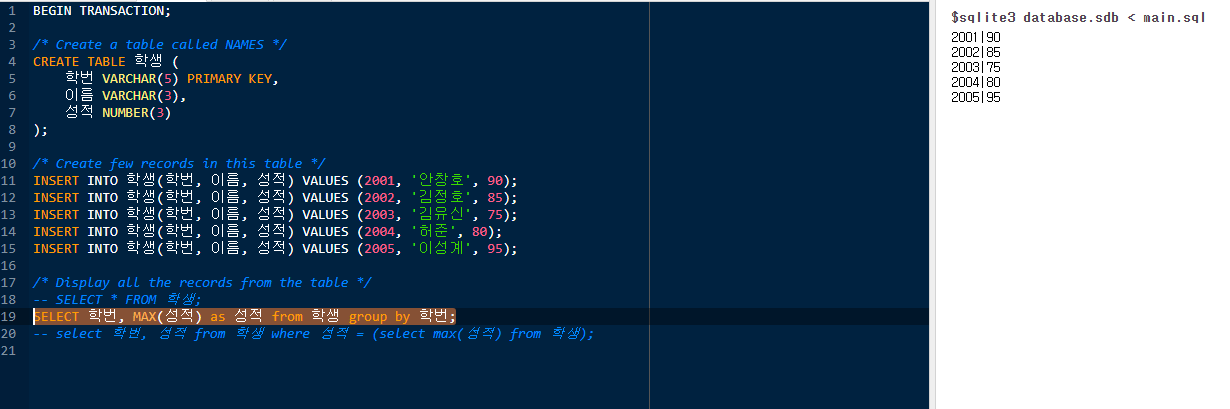 SELECT 학번, MAX(성적) as 성적 from 학생 group by 학번;
