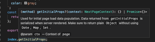 NextPage: pages 폴더에서 사용하는 컴포넌트 타입. NextPage는 리액트 컴포넌트의 확장으로, getInitialProps라는 함수를 갖고 있음.