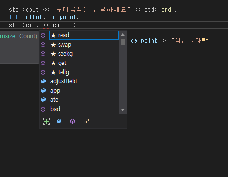 cin은 객체이기 때문에 cin. 을하면 수많은 메서드를 볼 수 있다.